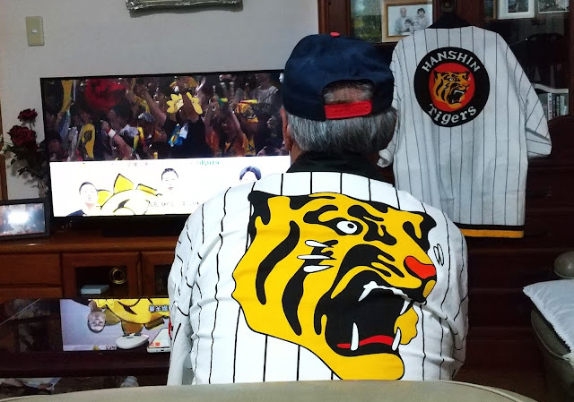 18年前に優勝した時に、勝田地域の阪神ファン(猛虎会)が「祝優勝阪神タイガース」の横断幕を作っていました。それをず~と持っていたので、案山子を建てる時には一緒に飾るつもりです。今年出しておかないと今後18年先まで生きていないのではないかな~